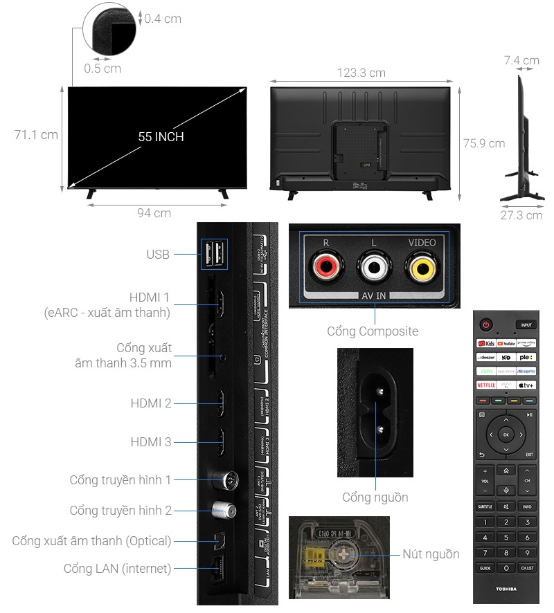 | Cổng nhận hình ảnh, âm thanh | 3 cổng HDMI có 1 cổng HDMI eARC (ARC), 1 cổng Composite |
