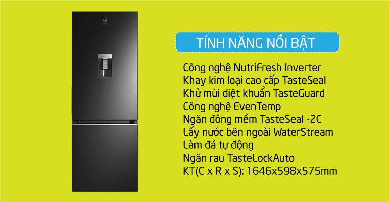 Tủ lạnh Electrolux này có thêm tiện ích nổi bật với khả năng lấy lước ngoài. Dung tích bình chứa nước lên dến 4 lít, bạn có thể thưởng thức những ly nước mát lạnh ngay lập tức mà không cần phải mở cửa, vừa thuận tiện, vừa tiết kiệm điện