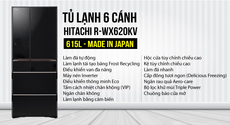 Tủ lạnh Hitachi chuẩn chất lượng Nhật Bản mang đến cho bạn và gia đình không gian sống tiện nghi, hiện đại, thông minh. R-WX620KV được thiết kế 6 cửa, mặt kính đen pha lê có dung tích lớn 615 lít cho không gian sử dụng thoải mái.