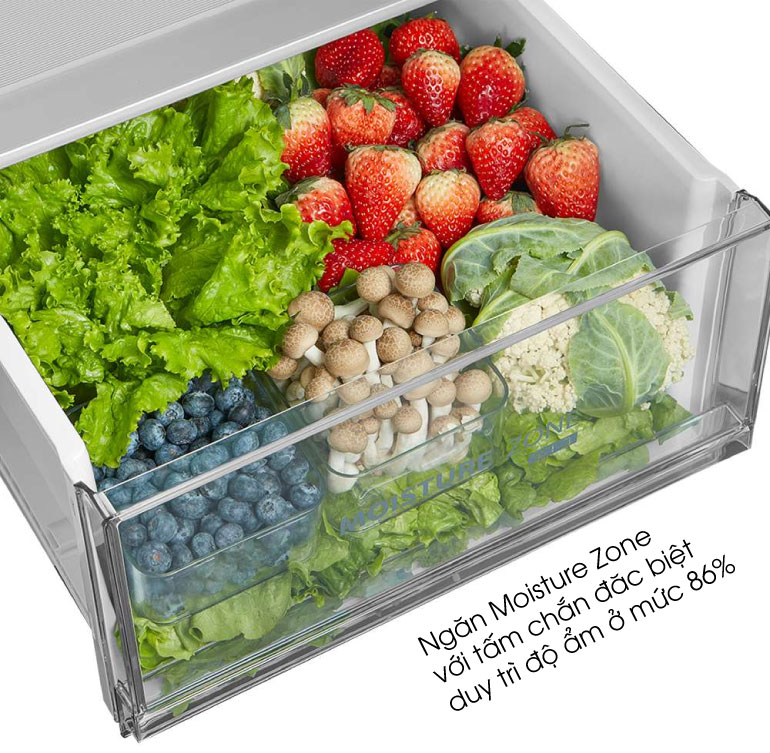 Ngăn Moisture Zone với tấm chắn đăc biệt giúp duy trì độ ẩm ở mức 86%, giữ thực phẩm luôn tươi ngon và vẹn nguyên dinh dưỡng.