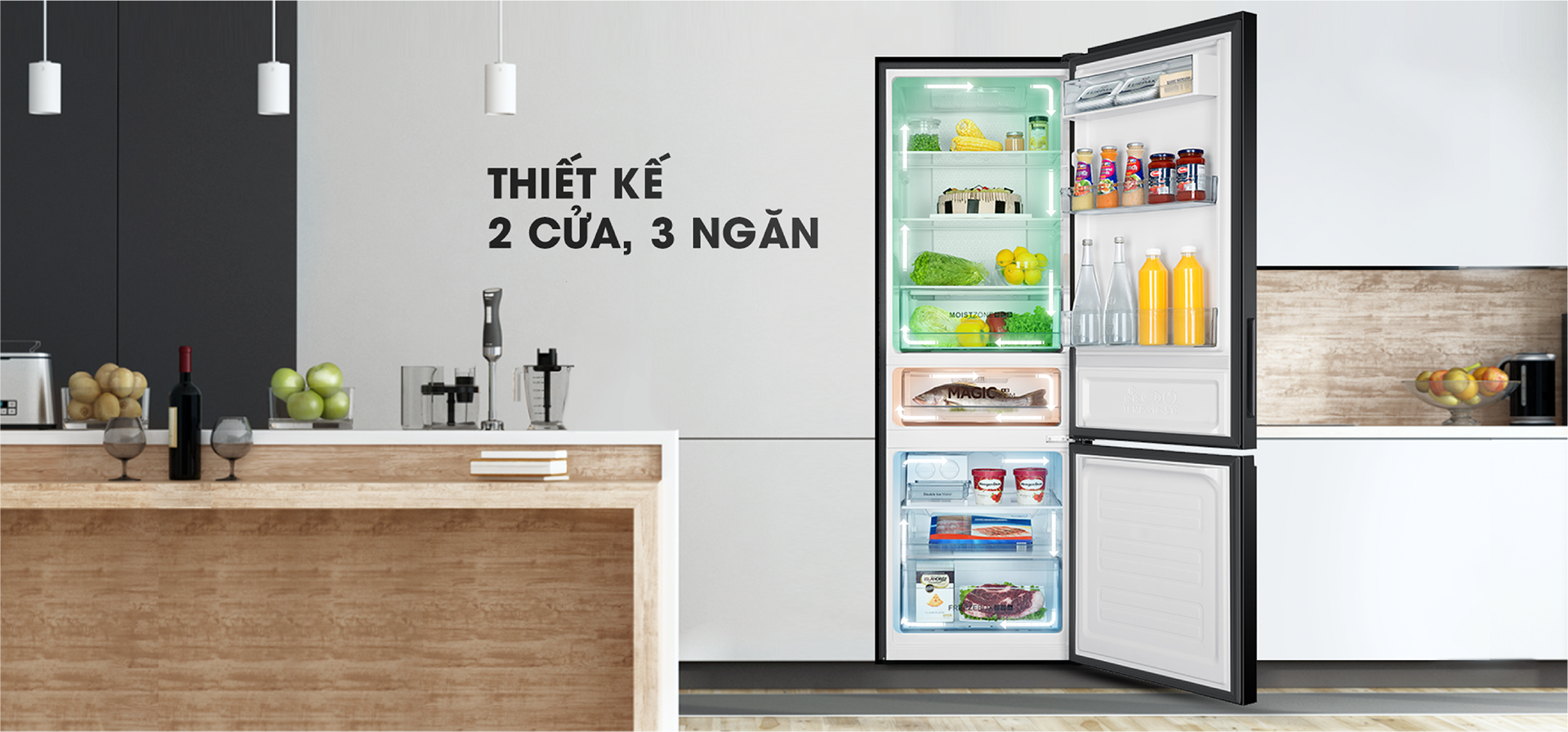 Tủ lạnh 2 cửa thiết kế 3 ngăn hoàn toàn độc lập, sẽ hạn chế tối đa sự lẫn mùi thức ăn giữa các ngăn, giúp bảo quản đa dạng các loại thực phẩm khác nhau một cách tiện lơi.