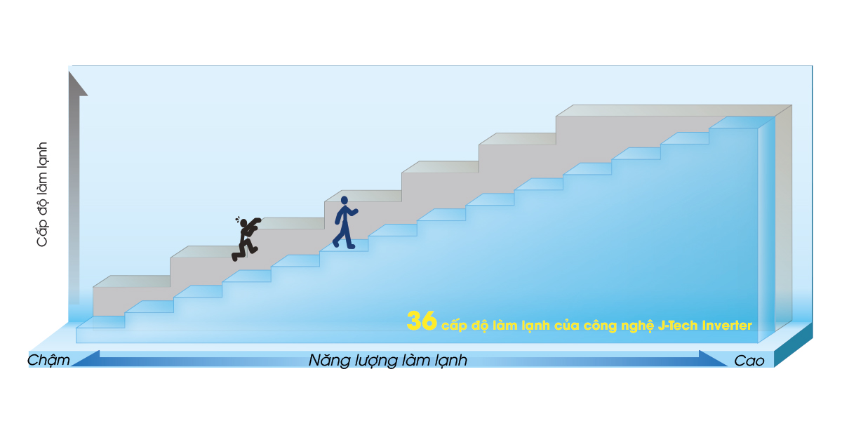 Với công nghệ J-Tech Inverter, thiết bị thay đổi công suất làm lạnh ở 36 cấp độ, nhiều hơn công nghệ Inverter thông thường với chỉ 5 cấp độ. Điều này giúp thiết bị điều chỉnh cấp độ vận hành để đáp ứng nhu cầu làm lạnh tương ứng hiệu quả, êm ái và hạn chế gây ra tiếng ồn.