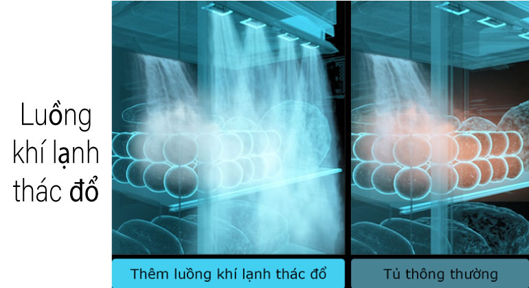 BÊN TRONG TỦ LẠNH ĐƯỢC LÀM LẠNH NHANH CHÓNG VÀ ĐỒNG ĐỀU VỚI THIẾT KẾ LÀM LẠCH THÁC ĐỔ ĐẰNG TRƯỚC VÀ SAU THEO CHIỀU TỪ PHÍA TRÊN XUỐNG