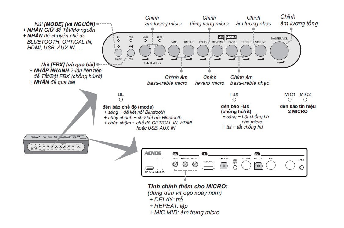 2 ngõ ra âm thanh nhạc+mic AUX OUT (jack 3.5mm & 6.35mm) nối với loa BT, dàn âm thanh ngoài, ...