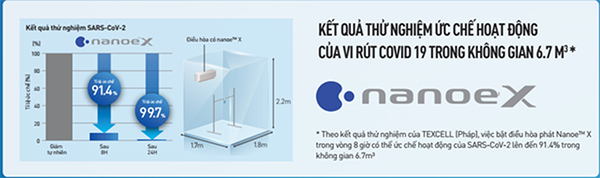 Cụ thể, Tổ chức Nghiên cứu Tiếp xúc Toàn Cầu Texcell đã xác minh khả năng ức chế vi rút SARS-CoV-2 của điều hòa Panasonic trang bị công nghệ nanoe™ X. Theo đó, điều hòa được trang bị nanoe™ X có thể ức chế 91,4% hoạt động của SARS-CoV-2 trong không gian kín 6,7m3 sau 8 giờ bật điều hòa.