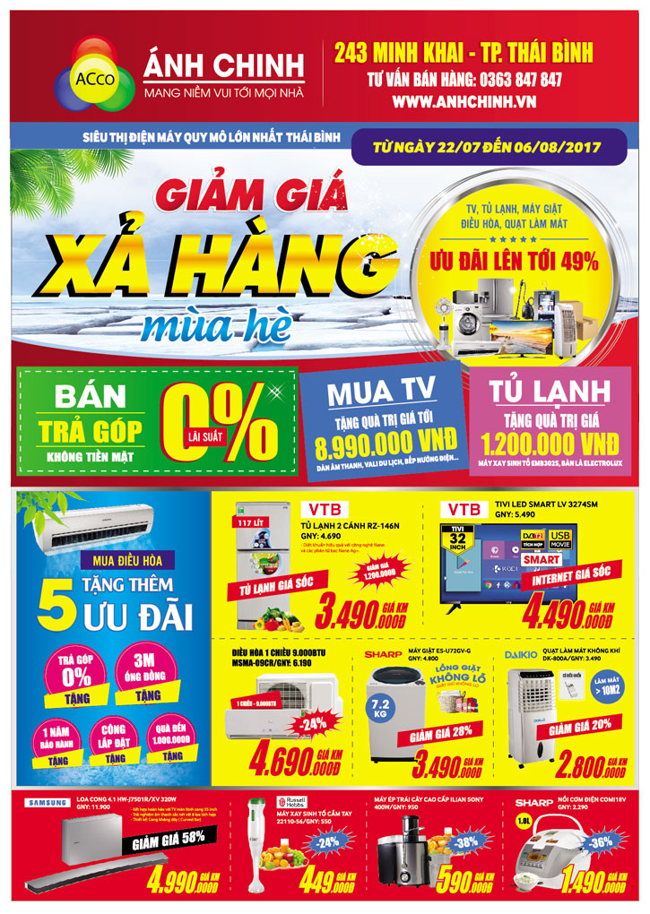 Từ ngày 22/7 đến 6/8/2017 siêu thị điện máy Ánh Chinh tiếp tục chương trình khuyến mại "Xả hàng hè giá sốc"